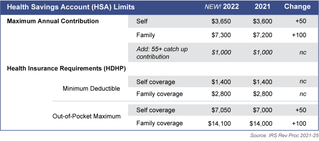 The savings limits for the ever-popular health savings accounts (HSA) are set for 2022. The new limits are outlined here with current year amounts noted for comparison. So plan now for your contributions.